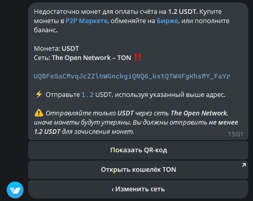 Перед использованием данного способа пополнения необходимо пополнить внутренний кошелёк данного бота, воспользовавшись Биржей или P2P (рекомендуется), либо совершить оплату с помощью внешнего криптокошелька, переведя криптовалюту по указанному в боте адресу. На скриншоте ниже можно увидеть, что бот ожидает пополнения именно с USDT в сети TON.