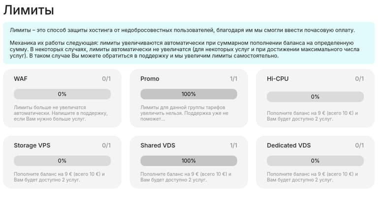 Перейдя в этот раздел, вы сможете изучить ограничения каждого вида предоставляемых услуг и требования, которые позволят вам превысить текущие значения.