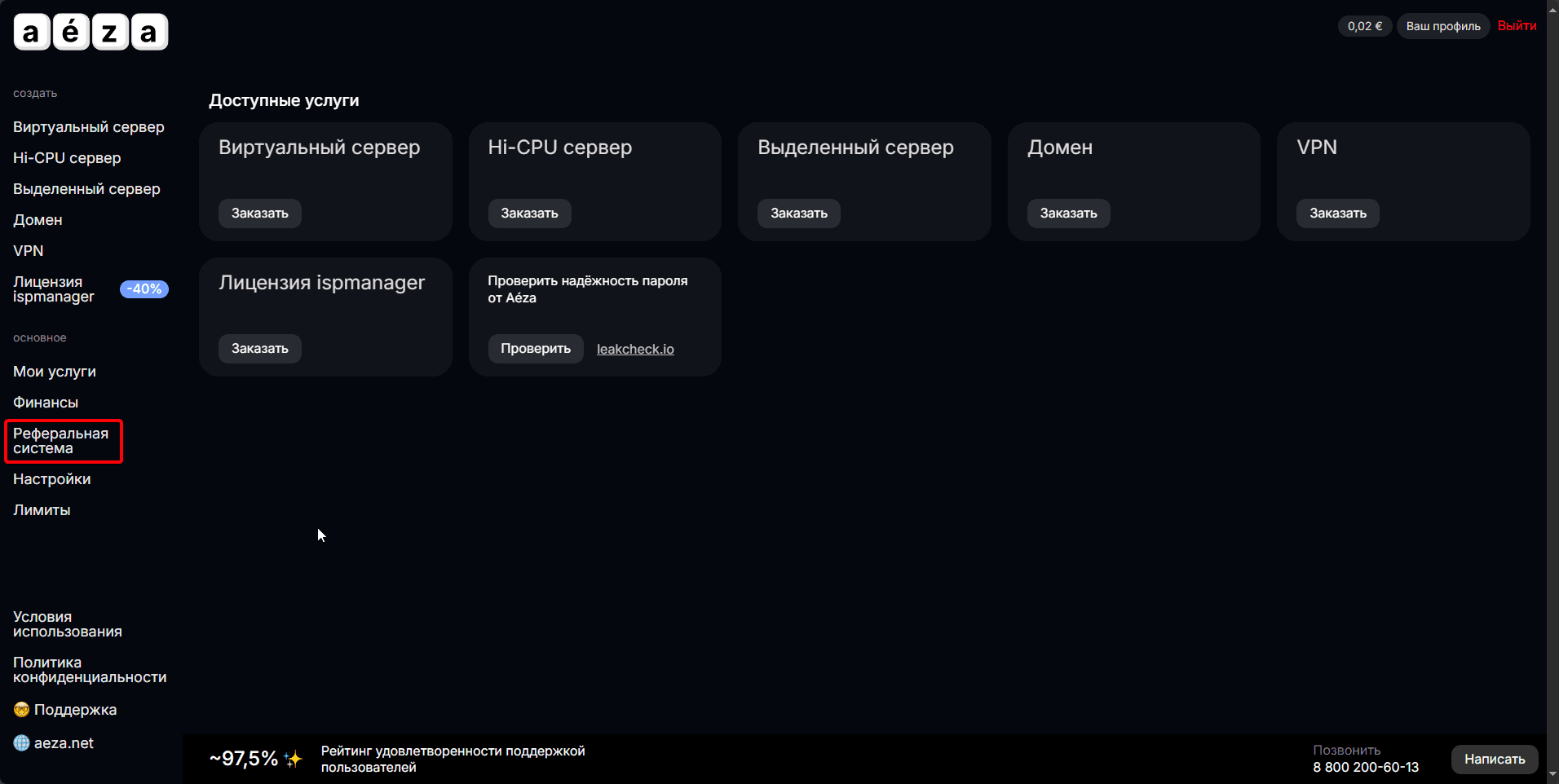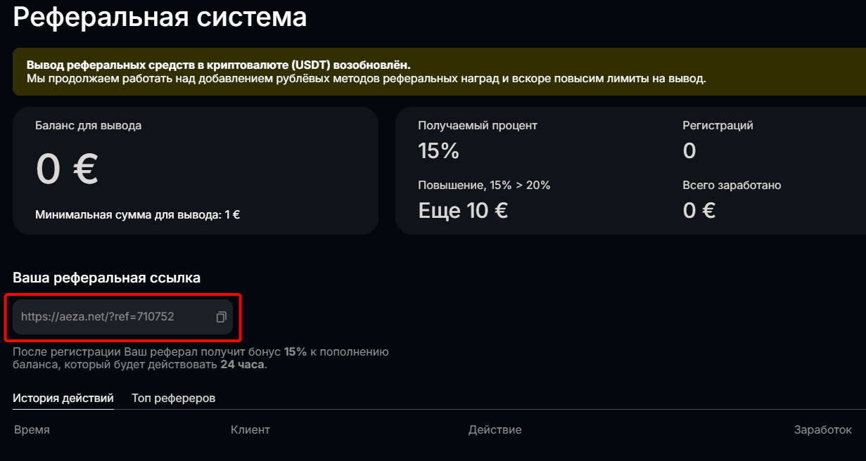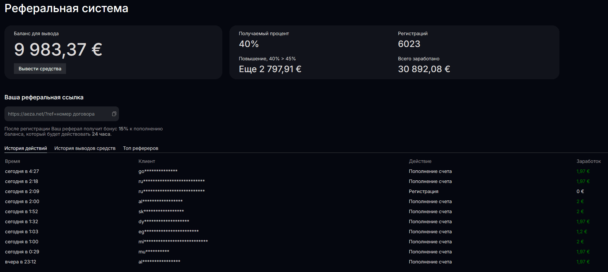 Реферальная система - это система денежных наград для наших клиентов, которые рекомендуют Aéza друзьям и коллегам, продвигают свою реферальную ссылку на собственных сайтах, таргетированной рекламе и даже оффлайн видах продвижения.