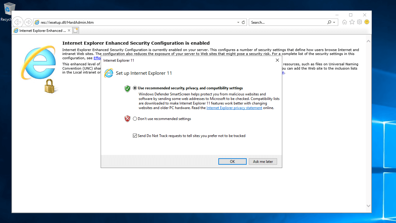 Подключаемся к удаленному серверу. Открываем Internet Explorer, выбираем рекомендуемые настройки и нажимаем OK.