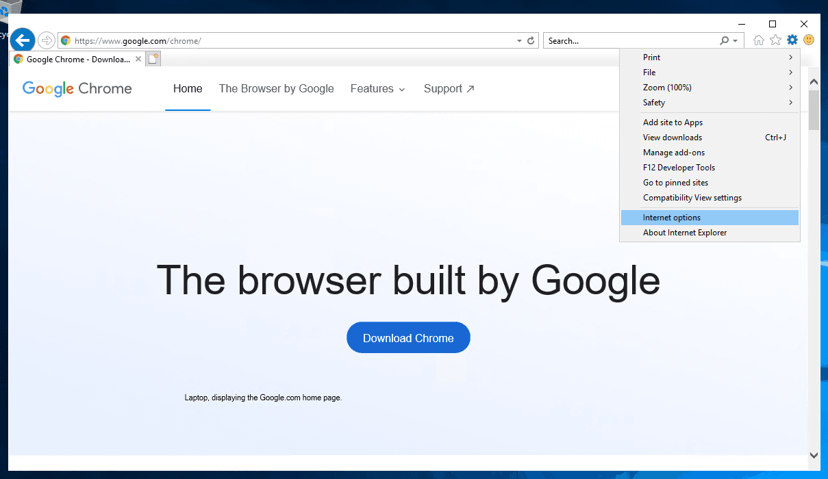 Следом нам нужно найти и выбрать шестеренку в верхнем углу браузера. Затем нажимаем на кнопку Internet options.