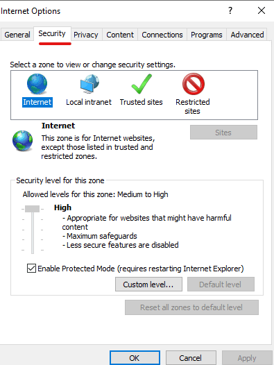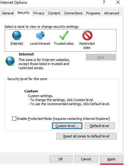 Убираем галочку с пункта Enable Protected Mode и нажимаем на кнопку Custom level. В открывшемся окне листаем вниз и ищем данные разделы:
