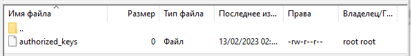 Находим пустой файл authorized_keys и открываем его ПКМ для правки.