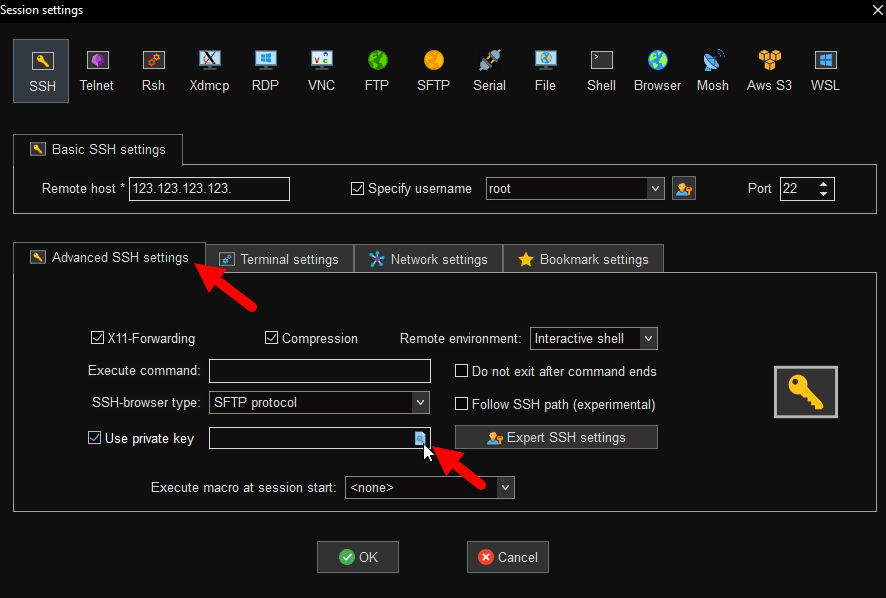 Укажем логин, добавив через «@» IP-сервера и привяжем приватный ключ. Вводим название сохраненных настроек подключения (сессии).