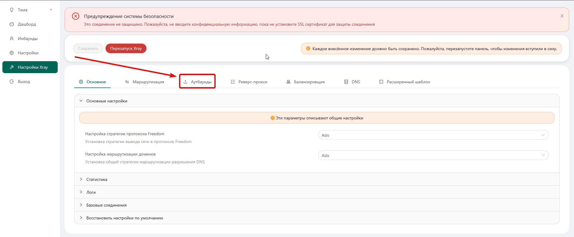 Для начала войдите в 3x-ui паенль и перейдите в раздел "Настройки Xray"