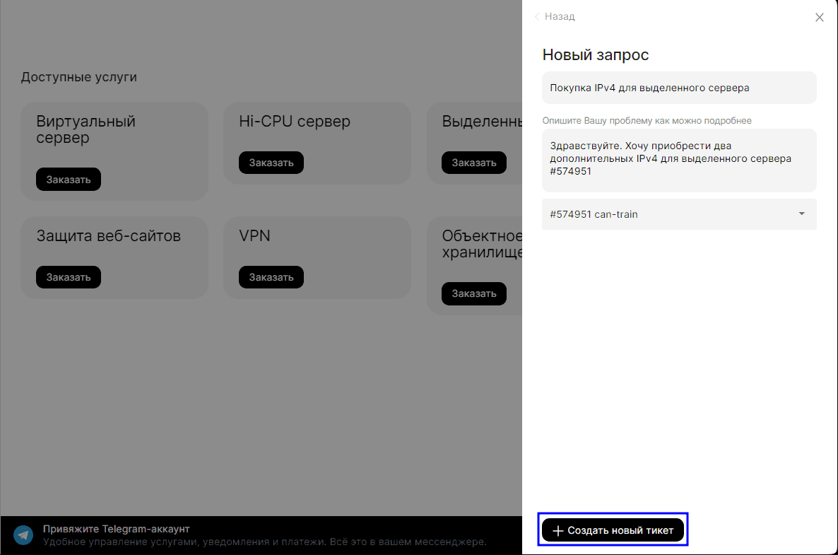 Укажем в теме обращения «Покупка IPv4 для выделенного сервера» В обращении желательно указать количество дополнительных IP-адресов и ссылку или название выделенного сервера, для которого требуются новые IP-адреса. Создаём новый тикет.